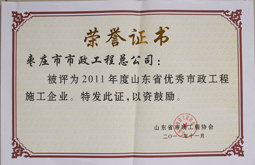 被山東省市政工程協(xié)會評為“2011年度山東省優(yōu)秀市政工程施工企業(yè)”