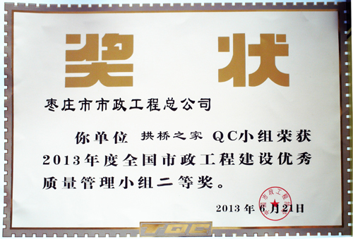 “拱橋之家”QC小組榮獲2013年度全國市政工程建設(shè)優(yōu)秀質(zhì)量管理小組二等獎