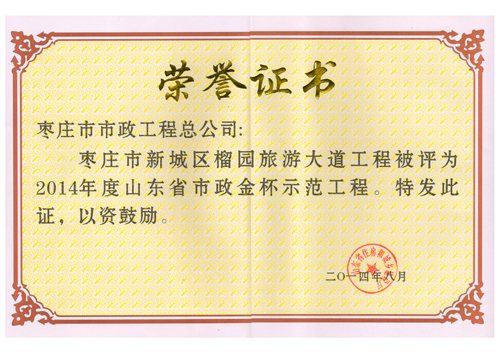 “棗莊市新城區(qū)榴園旅游大道工程”被評(píng)為2014年度全國市政金杯示范工程
